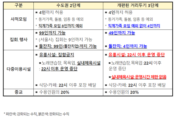 새로운 거리두기 3단계 조치를 적용하는 경우 기존 조치에 비해 개인 방역은 강화되나, 유흥시설 운영 재개(~22시), 실내체육시설 제한 해제(24시간 운영) 등 다중이용시설의 방역 조치 완화로 전반적인 방역 대응이 완화되는 것으로 오인될 가능성이 우려되기 때문이다.