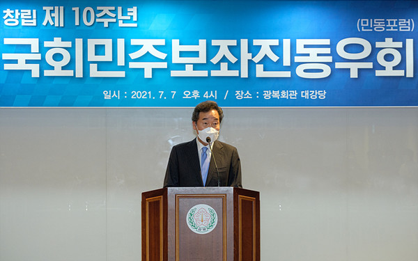 [뉴스인] 민경찬 기자 = 이낙연 전 더불어민주당 대표가 7일 오후 서울 영등포구 여의도동 광복회관 대강당에서 열린 국회민주보좌진동우회(민동포럼) 창립 10주년 기념행사에 참석해 축사하고 있다.