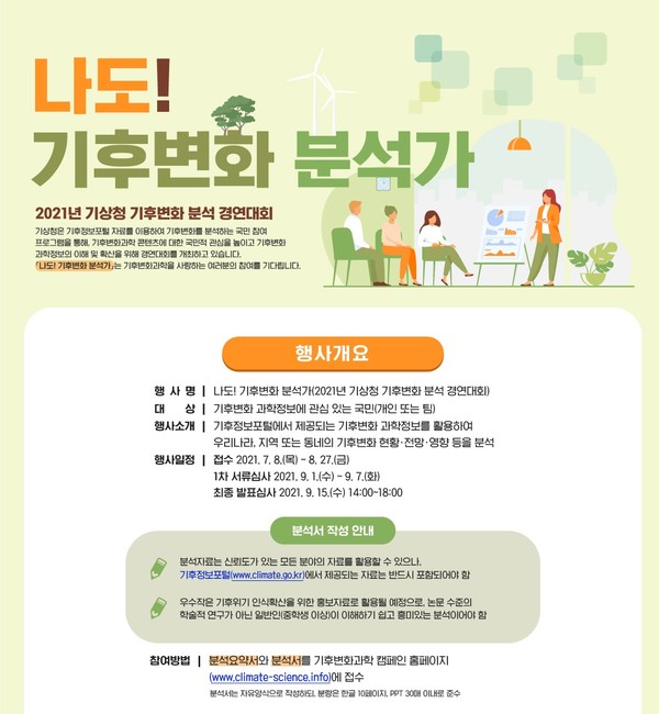 이번 경연대회는 기상청의 기후과학정보를 국민이 더욱 쉽게 접하고 깊게 생각해봄으로써 기후위기, 탄소중립으로의 빠른 인식 확산을 위해 마련되었다. 분석자료는 기후정보포털에서 제공되는 자료 중 3종 이상을 활용하여야 하며 우리나라·지역 또는 동네의 ▲기후변화 현황 ▲전망 ▲영향 등을 자유로운 형식으로 분석하면 된다.