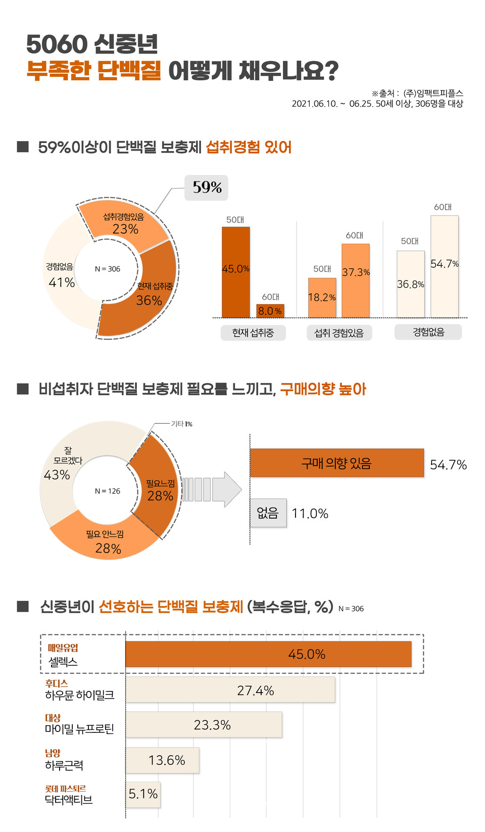 이번 설문에 따르면 5060 신중년 가운데 36%가 현재 단백질보충제를 섭취하고 있으며 23%는 섭취한 경험이 있다고 응답해 전체의 59%가 단백질보충제 섭취 경험이 있는 것으로 나타났다. 건강에 대한 관심이 높아지면서 단백질보충제가 신중년의 필수 영양식으로 자리 잡고 있는 것이다.