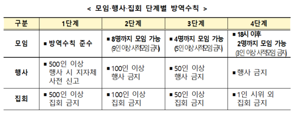 개편된 거리두기 4단계에 따르면 18시를 기점으로 그 이전 시간대에는 4명, 그 이후 시간대는 2명까지의 사적 모임만 허용한다. 또한 모든 행사가 금지되고 집회는 1인 시위를 제외한 모든 시위가 금지된다.