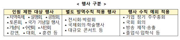 다만 행사의 구분에 따라 전시회‧박람회, 국제회의‧학술행사, 대규모 콘서트는 행사 기준이 아닌 별도의 방역수칙을 적용하여 운영하며 법령 등에 근거한 활동으로 기업의 필수 경영활동 및 공무에 필요한 경우는 기본방역수칙을 준수하며 개최를 허용한다.