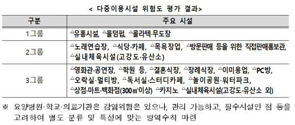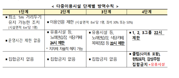 근거에 기반한 위험도 평가 실시 및 다중이용시설을 의료‧소비자‧보건 등 각 분야 전문가 질병관리청 국민 소통단의 자문 및 위험도 평가를 통해 시설별 위험도에 따라 3개 그룹으로 재분류한 가운데, 각 분류에 따라 위험도가 높은 그룹에 방역단계를 차등 강화한다. 단 4단계는 3개 그룹 모두 22시까지 운영시간을 제한한다.