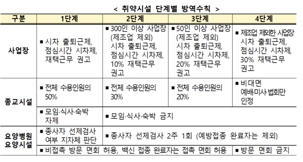 각 취약시설에 대한 별도의 수칙이 적용된다. 복지시설은 돌봄 공백 최소화를 위해 운영을 지속 하고 요양병원의 방문면회는 금지된다. 각 사업장은 특성에 맞게 방역수칙을 수립 관리하며, 공통적으로 4단계에서는 제조업을 제외한 모든 사업장은 시차 출퇴근제, 점심시간 시차제, 재택근무 30% 권고가 적용된다. 종교시설은 비대면 예배·미사·법회만 인정한다.