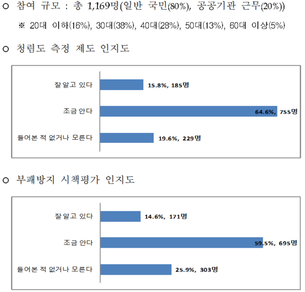 조사에 참여한 국민 대부분이 국민권익위의 공공기관 청렴수준 평가제도에 대해 알고 있다고 응답했다. 공공기관 외·내부 업무 경험자가 설문조사 방식으로 청렴수준을 평가하는 청렴도 측정은 80.4%가, 각급 기관의 반부패 정책 추진 실적을 평가하는 부패방지 시책평가는 74.1%가 알고 있는 것으로 나타났다.