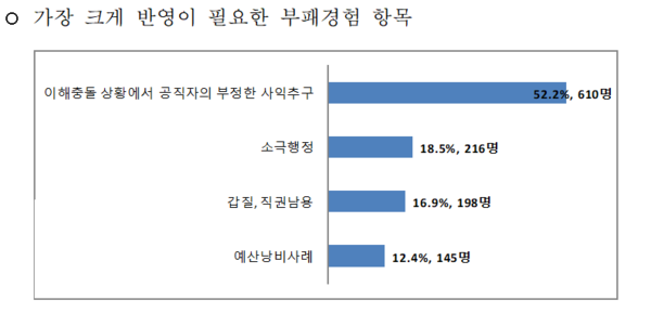 국민들의 공공기관 청렴수준에 대한 기대가 높아지면서 기존에는 부패로 인식되지 않던 것이 부패로 인식하는 추세를 반영해 청렴수준 평가에 새롭게 도입할 필요가 있는 항목도 질문했다. 과반수가 ‘이해충돌 상황에서 공직자의 부정한 사익 추구’ (52.2%)라고 응답했고, 소극행정(18.5%)이나 갑질·직권남용(16.9%)에 대한 부패경험을 조사하는 것도 필요하다고 응답했다.