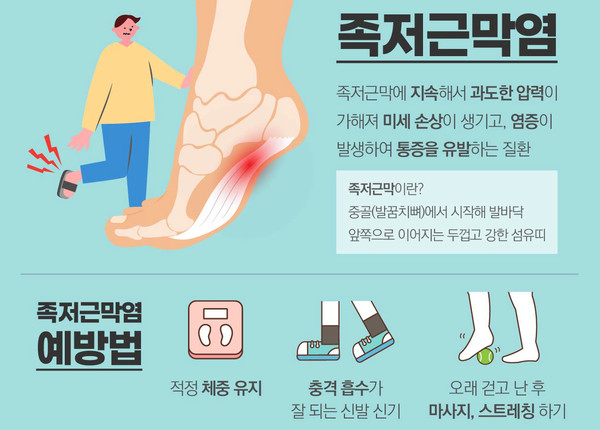 지난 2020년 건강보험심사평가원 통계에 따르면 족저근막염으로 치료받은 환자 수는 6월 39,406명, 7월 41,579명, 8월 39,197명으로 여름철에 가장 많았다. 잦은 야외활동과 함께 쿠션 없는 슬리퍼나 샌들, 납작구두 등을 착용할 경우 지면으로부터 가해지는 충격이 발바닥으로 직접 전해지면서 족저근막염의 원인이 될 수 있어 주의가 필요하다.