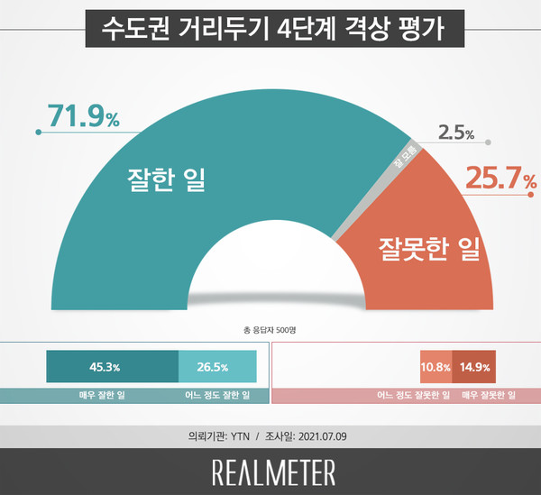 최근 방역당국이 코로나19 급증에 따라 수도권 거리두기를 4단계로 격상한 가운데, YTN <더뉴스> 의뢰로 여론조사 전문기관 리얼미터(대표 이택수)가 수도권 거리두기 4단계 격상에 대한 평가를 조사했다.