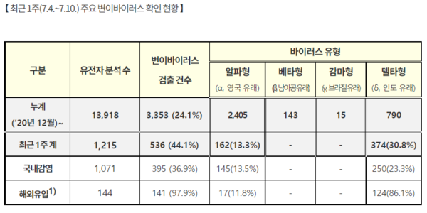 최근 1주(7.4.~7.10.) 추가로 확인된 주요 변이바이러스 확진자는 536명으로 바이러스 유형별로는 알파형 162명, 델타형 374명이었고 이 중 141명은 해외유입 사례, 395명은 국내감염 사례였다.