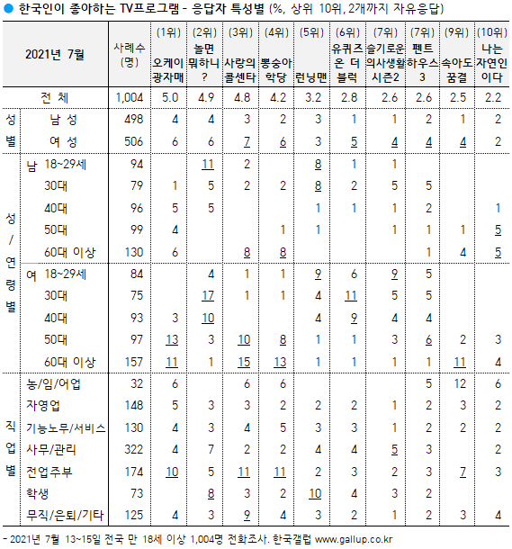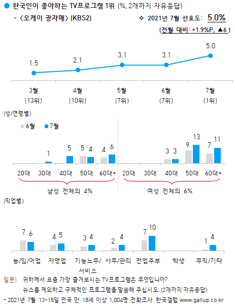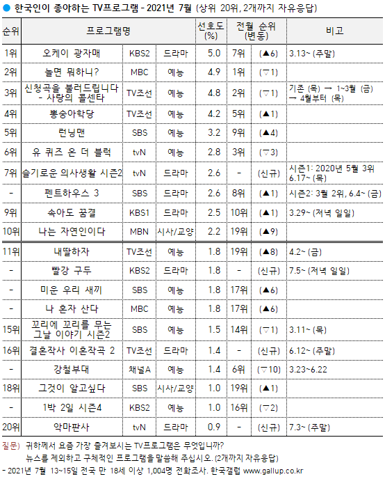 [뉴스인] 김태엽 기자=한국갤럽이 2021년 7월 13~15일 전국 만 18세 이상 1,004명에게 요즘 가장 즐겨보는 TV프로그램을 물은 결과(2개까지 자유응답), KBS2 주말 드라마 〈오케이 광자매〉가 선호도 5.0%로 1위를 차지했다. 같은 시간대 KBS2 주말극이 1위에 오른 것은 〈하나뿐인 내편〉(2019년 2~3월 1위) 이후 2년 4개월 만이다.