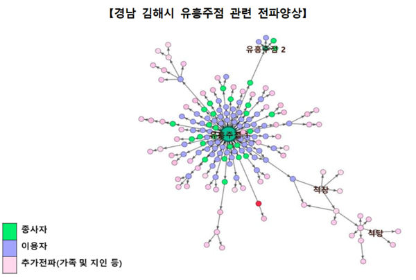 대규모 확진자가 발생한 주요 집단사례로는 부산 소재 주점 관련 유흥시설 이용자 중 총 236명의 확진자가 발생했다. 또한 경남 김해시 유흥주점 관련 종사자 선제검사에서 확진되었는데 증상발생 기간 중 다수의 시설에서 근무를 지속하여 동료 및 이용자 95명 및 가족·지인 등에게 추가전파 돼 총 188명의 확진자가 발생했다.