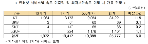 초고속 인터넷 개통 관련 조사결과 인터넷 개통처리시 속도를 측정하지 않거나, 측정하더라도 이용약관상 최저보장속도에도 미달된 건이 다수 발견됐다.