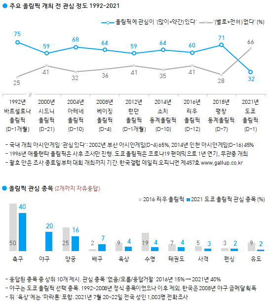 1992년 이후 주요 올림픽 개최 전 관심도('관심 있다' 응답 비율)와 비교할 때 이번 도쿄 올림픽은 최저 수준이다. 2012년 런던, 2016년 리우 올림픽 개최 직전 관심도는 각각 59%, 60%였고, 우리나라에서 열린 2018년 평창 동계올림픽 직전 관심도는 71%였다.