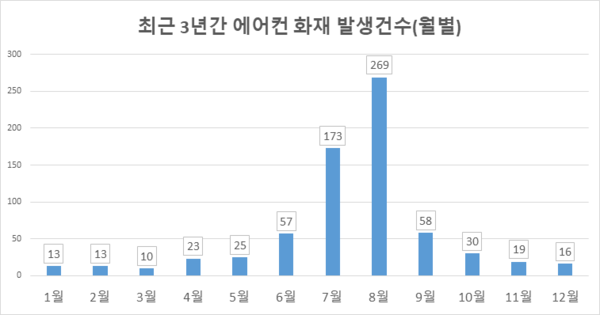 소방청에서 최근 3년간 에어컨 화재 발생 건수를 분석한 결과 총 706건의 에어컨 화재 중 8월이 269건(38%)으로 가장 많았으며 7월 173건, 9월 58건, 6월 57건 순으로 나타났다.