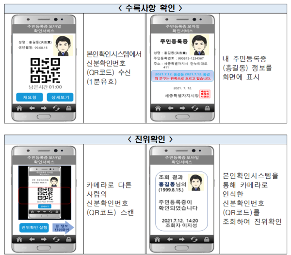주민등록증 모바일 확인서비스는 정부24를 통해 본인확인 절차를 거친 후 QR코드를 수신하여 주민등록증 수록사항을 화면에 표시하거나 또는 스캔하여 타인의 주민등록증 진위여부를 확인하는 방식으로 이용하게 된다.