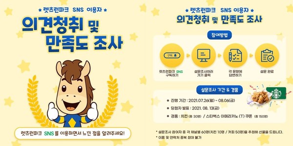 만족도 조사와 관련한 자세한 내용은 각 SNS 채널에서 확인할 수 있으며 설문 응답자 중 추첨을 통해 치킨(총 30명), 커피 음료(총 150명) 쿠폰 등을 사은품으로 증정할 예정이다.
