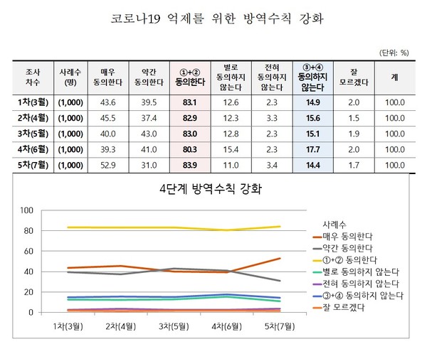 조사 결과 지난 7월23일에 시행한 수도권 사회적 거리두기 4단계 연장 조치에 대해 찬성하는 의견이 84.0% 반대하는 의견이 12.8%로 찬성하는 의견이 많은 것으로 확인됐다.