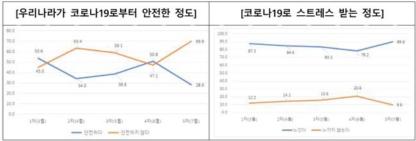 4차 유행이 진행 중인 가운데, 우리나라가 코로나19로부터 안전하다는 응답은 지난달보다 큰 폭으로 하락했고 스트레스를 느낀다는 응답은 크게 상승했다.