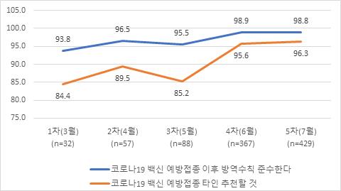 접종자는 접종 후에도 방역수칙을 잘 준수하고 있으며(98.8%) 주변에 예방접종을 추천할 의향도 높은 것(96.3%)을 확인됐다.