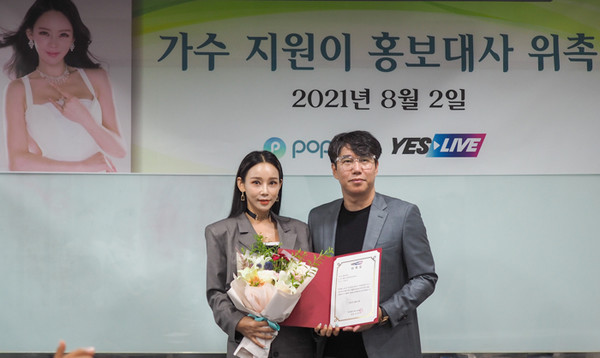 [뉴스인] 민경찬 기자 = 트로트 가수 지원이(왼쪽)가 지난 2일 서울 구로동의 팝켓 스튜디오에서 (주)예스라이브 팝켓 홍보대사에 위촉돼 위촉식을 마치고 유태건 회장과 기념 촬영을 하고 있다.