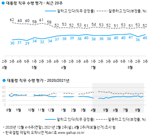 [뉴스인] 이현우 기자 =한국갤럽이 2021년 8월 셋째 주(17~19일) 전국 만 18세 이상 1,001명에게 문재인 대통령이 대통령으로서의 직무를 잘 수행하고 있다고 보는지 잘못 수행하고 있다고 보는지 물은 결과, 40%가 긍정 평가했고 52%는 부정 평가했으며 그 외는 의견을 유보했다(어느 쪽도 아님 3%, 모름/응답거절 5%).