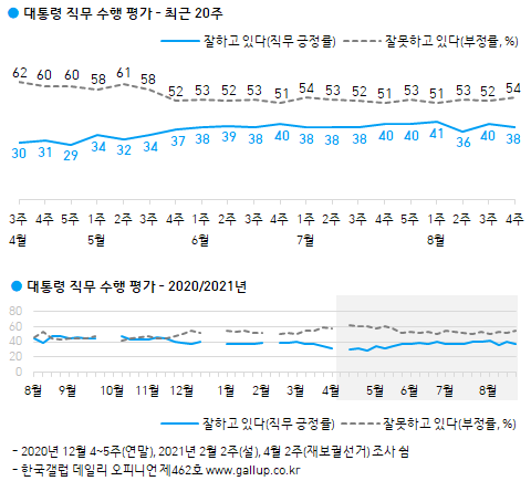 [뉴스인] 이현우 기자 =한국갤럽이 2021년 8월 넷째 주(24~26일) 전국 만 18세 이상 1,000명에게 문재인 대통령이 대통령으로서의 직무를 잘 수행하고 있다고 보는지 잘못 수행하고 있다고 보는지 물은 결과, 38%가 긍정 평가했고 54%는 부정 평가했으며 그 외는 의견을 유보했다(어느 쪽도 아님 3%, 모름/응답거절 5%).