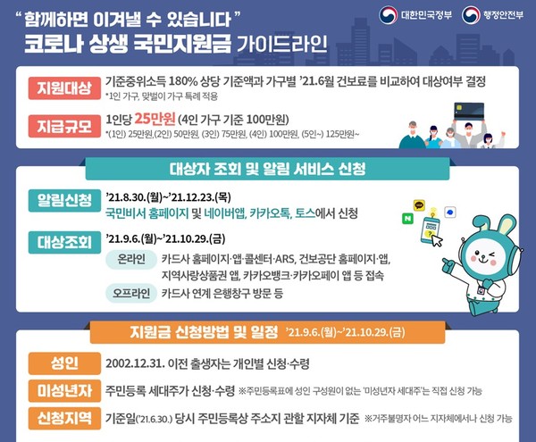 남은 일주일의 기간 동안 신청·지급 시스템 등 제반 사항을 철저히 확인·점검하는 한편, 신청·지급이 시작된 이후에도 콜센터, 찾아가는 신청, 온라인 이의신청 등을 통해 국민 여러분들의 불편이 최소화되도록 조치할 예정이다.