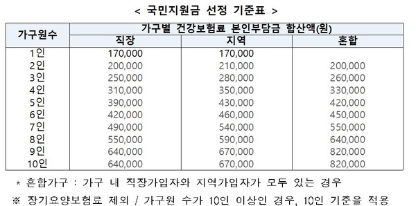 1인 가구는 고령자, 비경제활동 인구가 많은 특성을 고려하여 직장가입자 기준 연소득 5800만원에 해당하는 건강보험료로 상향 조정하였으며 가구 내 소득원이 2인 이상인 맞벌이 가구는 가구원 수를 1명 추가한 선정기준표를 적용하되 지역가입자는 20년 종합소득 300만원 이상인 경우를 소득원으로 본다. 예를 들어 2인 맞벌이가구는 3인가구와 동일한 건보료 기준액을 적용한다.
