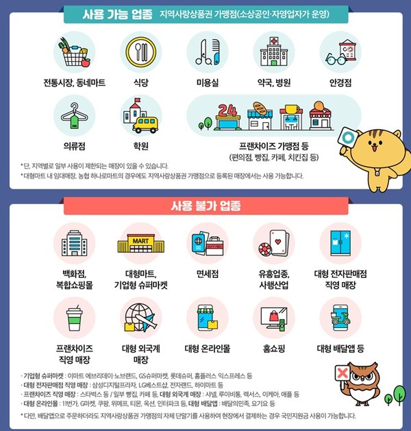 대표적으로 전통시장, 동네 슈퍼마켓, 식당, 미용실, 약국, 안경점, 의류점, 학원, 병원, 프랜차이즈 가맹점(편의점, 빵집, 카페, 치킨집 등) 등에서 사용이 가능하며 지역사랑상품권 앱, 자치단체 홈페이지 또는 국민지원금 사용처 홈페이지에서 확인할 수 있다. 국민지원금은 12월31일까지 약 4개월간 사용할 수 있으며 기간 내에 사용하지 않은 잔액은 국가와 자치단체로 환수될 예정이다.