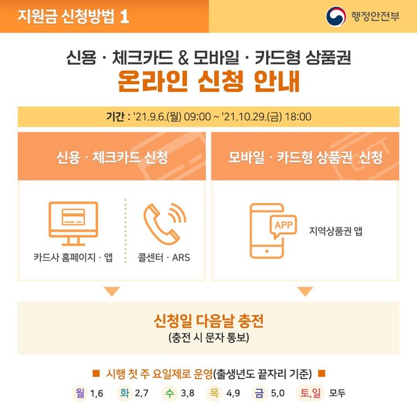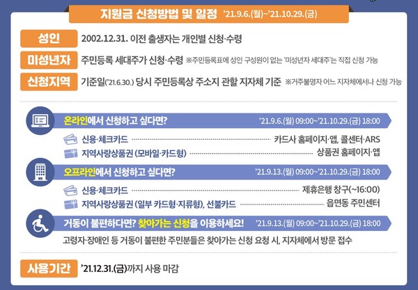 지역사랑상품권 모바일형·카드형으로 국민지원금을 받으려는 국민은 9월6일부터 주소지를 관할하는 지자체의 지역사랑상품권 앱 또는 홈페이지에서 온라인으로 신청할 수 있으며 신청일 다음날 본인이 소지한 지역사랑상품권에 충전되며 기존의 지역사랑상품권 잔액과는 구별되어 우선 사용된다. 9월13일부터는 주소지를 관할하는 읍면동 주민센터에 방문하여 신청할 수 있다. 읍면동 주민센터에서는 지류형 지역사랑상품권 및 선불카드가 지급된다. 대상자 조회, 온·오프라인 신청 모두 시행 첫 주에는 출생년도 끝자리에 따라 요일제를 적용할 예정이다. 첫 주 이외에는 요일제와 관계없이 모두 조회 및 신청이 가능하다. 국민지원금은 10월 29일까지 약 두 달간 신청할 수 있으며, 신청하지 않은 금액은 국가와 자치단체로 환수될 예정이다.