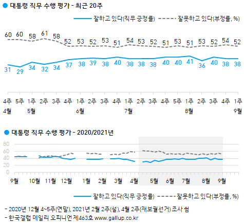 [뉴스인] 김태엽 기자 =한국갤럽이 2021년 9월 첫째 주(8/31~9/2) 전국 만 18세 이상 1,000명에게 문재인 대통령이 대통령으로서의 직무를 잘 수행하고 있다고 보는지 잘못 수행하고 있다고 보는지 물은 결과, 38%가 긍정 평가했고 52%는 부정 평가했으며 그 외는 의견을 유보했다(어느 쪽도 아님 4%, 모름/응답거절 6%).