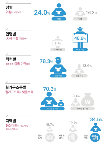우리나라 성인의 문해능력은 연령이 높을수록, 월 가구소득이 낮을수록, 학력이 낮을수록, 농산어촌에 거주할수록 낮은 것으로 나타났으며, 학력별, 월 가구소득별 문해능력 격차가 가장 크게 나타났다.