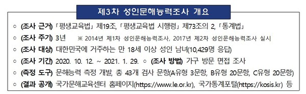 교육부와 국평원은 국민의 문해능력 실태를 파악하여 성인문해교육 정책 수립 등에 활용하기 위해 3년 주기로 전국의 만 18세 이상 성인을 대상으로 문해능력 수준을 조사하여 그 결과를 발표하고 있다.