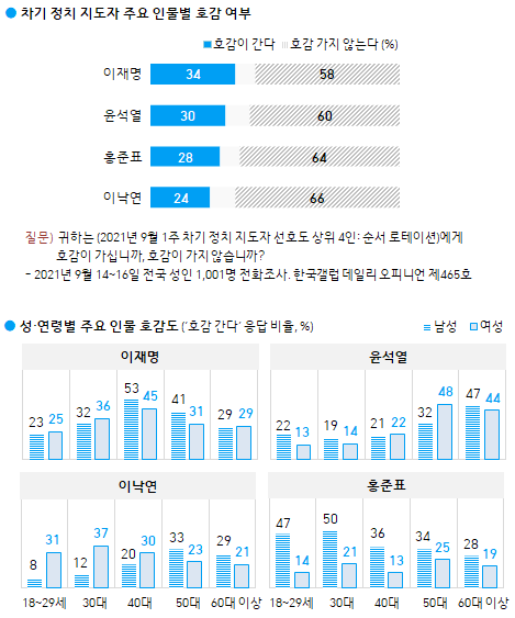 [뉴스인] 김태엽 기자 =2021년 9월 14~16일 전국 성인 1,001명에게 차기 정치 지도자로 거론되는 여야 주요 인물 4인 각각에 대한 호감 여부를 물었다(순서 로테이션). 그 결과 '호감이 간다'는 응답은 이재명 경기도지사 34%, 윤석열 전 검찰총장 30%, 홍준표 국민의힘 의원 28%, 이낙연 더불어민주당 전 대표 24% 순으로 나타났다.