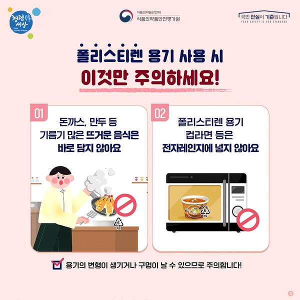 식약처는 "폴리스티렌 용기에 끓는 물을 넣었을 때 문제는 없더라도 바로 튀긴 뜨거운 튀김류를 담거나 전자레인지 등으로 가열 시 용기에 변형이 생기거나 구멍이 날 수 있으므로 기름기가 많은 뜨거운 식품을 담거나 전자레인지로 가열하지 않도록 주의해야 한다"고 밝혔다.