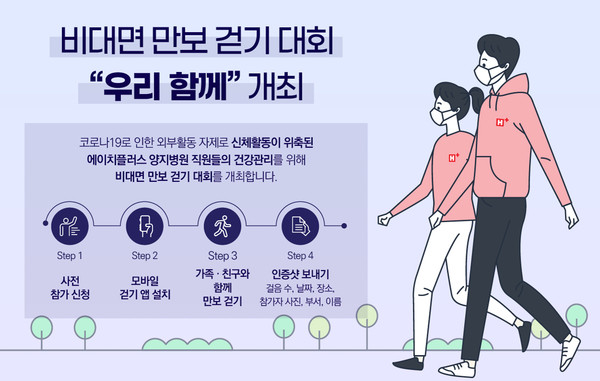 [뉴스인] 민경찬 기자 = 에이치플러스(H+) 양지병원(병원장 김상일)이 코로나19로 외부활동이 제한된 가운데 신체활동이 위축된 병원 직원들의 건강관리와 힐링을 위한 비대면 만보걷기 ‘우리 함께’를 개최한다.