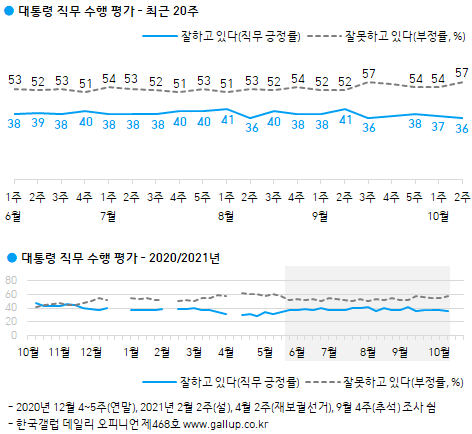 [뉴스인] 이현우 기자 =한국갤럽이 2021년 10월 둘째 주(12~14일) 전국 만 18세 이상 1,000명에게 문재인 대통령이 대통령으로서의 직무를 잘 수행하고 있다고 보는지 잘못 수행하고 있다고 보는지 물은 결과, 36%가 긍정 평가했고 57%는 부정 평가했으며 그 외는 의견을 유보했다(어느 쪽도 아님 3%, 모름/응답거절 5%).