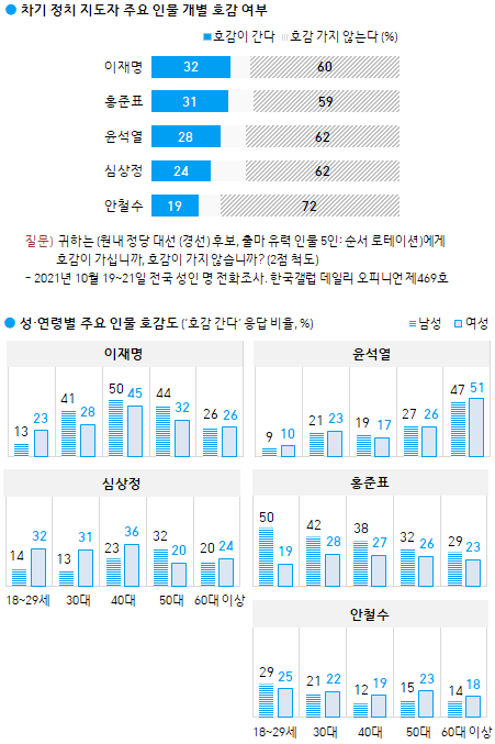[뉴스인] 김태엽 기자 =2021년 10월 19~21일 전국 성인 1,000명에게 여야 원내 정당 대선 (경선) 후보 또는 출마 유력 인물 5인 각각에 대한 호감 여부를 물었다(순서 로테이션). 그 결과 '호감이 간다'는 응답은 이재명 경기도지사 32%, 홍준표 국민의힘 의원 31%, 윤석열 전 검찰총장 28%, 심상정 정의당 의원 24%, 안철수 국민의당 대표 19% 순으로 나타났다. 비호감도('호감 가지 않는다' 응답)는 안철수가 72%로 가장 높고, 다른 네 사람은 60% 내외다.