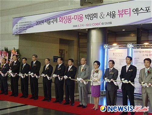 【서울=뉴시스헬스】강선화 기자 = 7일 대한화장품협회 주최로 삼성동 코엑스 1층 인도양홀에서 열린 '서울국제화장품ㆍ미용박람회' 개막식에서 대한화장품협회 안정림 부회장(왼쪽에서 여섯번째)과 업체 관계자들이 테이프 커팅을 하고 있다. <관련기사 있음>