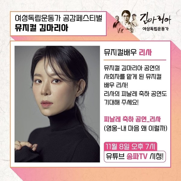 또한 2021년 뮤지컬 김마리아 공연의 사회와 피날레에 부를 '영웅'의 '내 마음이 왜 이럴까'를 하기로 한 뮤지컬배우 리사는 수많은 공연과 작품에 출연한 뮤지컬계의 최정상 배우다. 리사는 "집안 또한 독립운동을 했었기에 너무나 뜻깊은 자리가 될 것 같다"고 밝혔다.