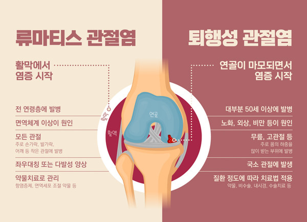 퇴행성 관절염은 무릎, 고관절 등 주로 몸의 하중을 많이 받는 관절에 국수적으로 발생하며 노화나 비만 등이 원인으로 작용하며 50대 이상 환자가 많다. 치료는 관절염 진행 정도에 따라 약물·주사 치료, 내시경 치료, 인공관절 치환술까지 다양한 치료법을 적용할 수 있다. 반면에 류머티즘 관절염은 전 연령에서 나타날 수 있고, 30~50대 환자가 많다. 초기 관절 손상이 빠르게 진행되며 증상을 방치할 경우 관절 변형과 함께 폐, 심장, 신장, 혈관 등 주요 장기까지 침범해 치명적인 합병증이 나타날 수 있어 조기 진단과 치료가 중요하다.