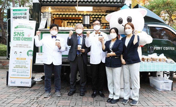 KODA 문인성 원장과 장기 기증 코디네이터들은 지난 2일 오전 11시부터 오후 1시30분까지 명지병원 T관(주차타워) 앞 공원에 커피 트럭을 배치하고 명지병원 교직원들에게 무료로 커피와 음료를 제공하는 응원캠페인을 진행했다.