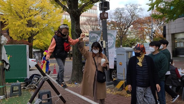 [뉴스인] 정경호 기자 = 7일 오후 전남 순천 순천부읍성 남문터 광장 일원에서 '순천문화재 야행' 순천부 읍성 부활 행사가 열려 엄마 손을 잡은 한 어린이가 줄타기 체험을 하고 있다.