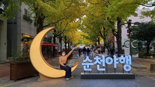 [뉴스인] 정경호 기자 = 7일 오후 전남 순천 순천부읍성 남문터 광장 일원에서 '순천문화재 야행' 순천부 읍성 부활 행사가 열려 야행을 즐기러 나온 한 여성이 조형물에 앉아 기념 사진을 찍고 있다.
