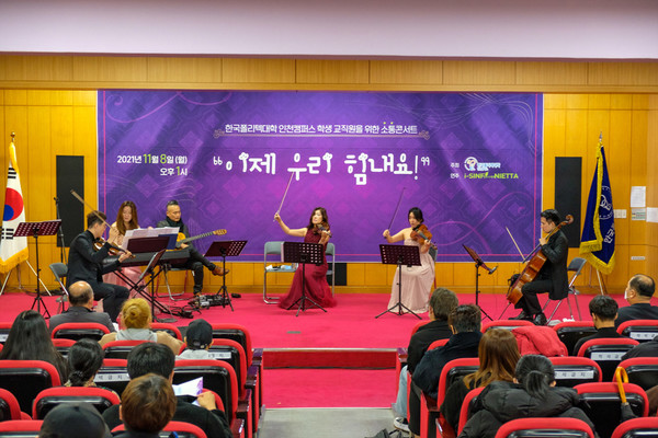 [뉴스인] 민경찬 기자 = 8일 오후 인천 부평구 소재 한국폴리텍대학 인천캠퍼스 제6기술관 강당에서 i-신포니에타(단장 조화현)의 학생·교직원을 위한 클래식 음악회 "이제 우리 힘내요"가 열려 i-신포니에타 단원들이 연주하고 있다.