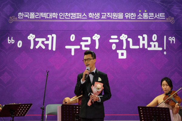 [뉴스인] 민경찬 기자 = 8일 오후 인천 부평구 소재 한국폴리텍대학 인천캠퍼스 제6기술관 강당에서 i-신포니에타(단장 조화현)의 학생·교직원을 위한 클래식 음악회 "이제 우리 힘내요"가 열려 테너 정진성이 미스터 트롯의 히트곡 '바램'을 들려주고 있다.