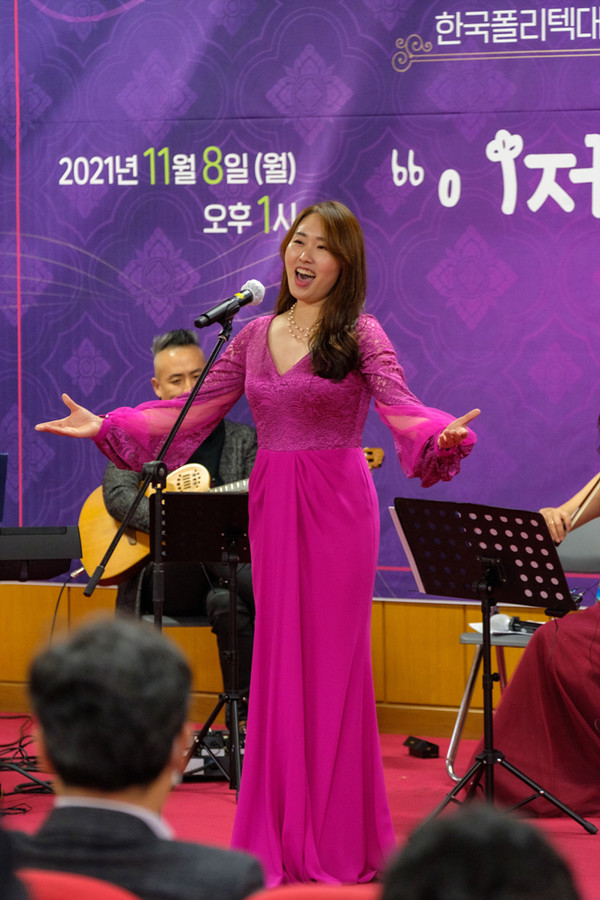 [뉴스인] 민경찬 기자 = 8일 오후 인천 부평구 소재 한국폴리텍대학 인천캠퍼스 제6기술관 강당에서 i-신포니에타(단장 조화현)의 학생·교직원을 위한 클래식 음악회 "이제 우리 힘내요"가 열려 소프라노 정수진이 연주하고 있다.