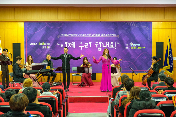[뉴스인] 민경찬 기자 = 8일 오후 인천 부평구 소재 한국폴리텍대학 인천캠퍼스 제6기술관 강당에서 i-신포니에타(단장 조화현)의 학생·교직원을 위한 클래식 음악회 "이제 우리 힘내요"가 열려 테너 정진성과 소프라노 정수진이 '아름다운 나라'를 열창하고 있다.