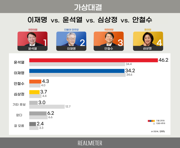 [뉴스인] 장재필 기자 =여론조사 전문기관 리얼미터(대표 이택수)가 <오마이뉴스> 의뢰로 지난 7~8일 전국 18세 이상 2,014명을 대상으로 2021년 11월 2주 차기 대선주자 이재명·윤석열·심상정·안철수 4자 대결 지지도 조사를 실시한 결과, 국민의힘 윤석열 후보가 10월 4주 조사 대비 11.8%포인트 큰 폭으로 상승한 46.2%를 기록, 40%중후반대로 올라섰다. 2위 더불어민주당 이재명 후보와의 차이는 12.0%포인트로 지난 조사(0.2%포인트)보다 오차범위(±2.2%P) 밖으로 크게 벌어졌다.