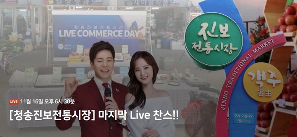 청송진보시장의 라이브 판매는 경북경제진흥원의 전통시장 온라인 활성화 지원사업으로 전통시장의 다양한 상품을 개발하여 라이브로 판매하고 있다.